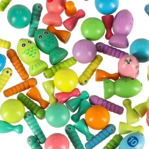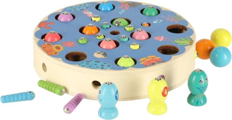 Zábavná a vzdělávací dřevěná hra pro děti od 3 let, která kombinuje magnetické rybaření, chycení housenek, třídění barev a počítání. Podporuje jemnou motoriku, koordinaci oko‑ruka a logické myšlení. Barevné, hladce broušené dílky z bezpečně lakovaného dřeva lákají k objevování a společné rodinné hře.