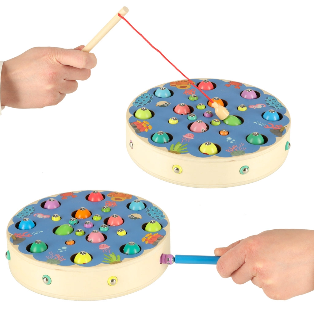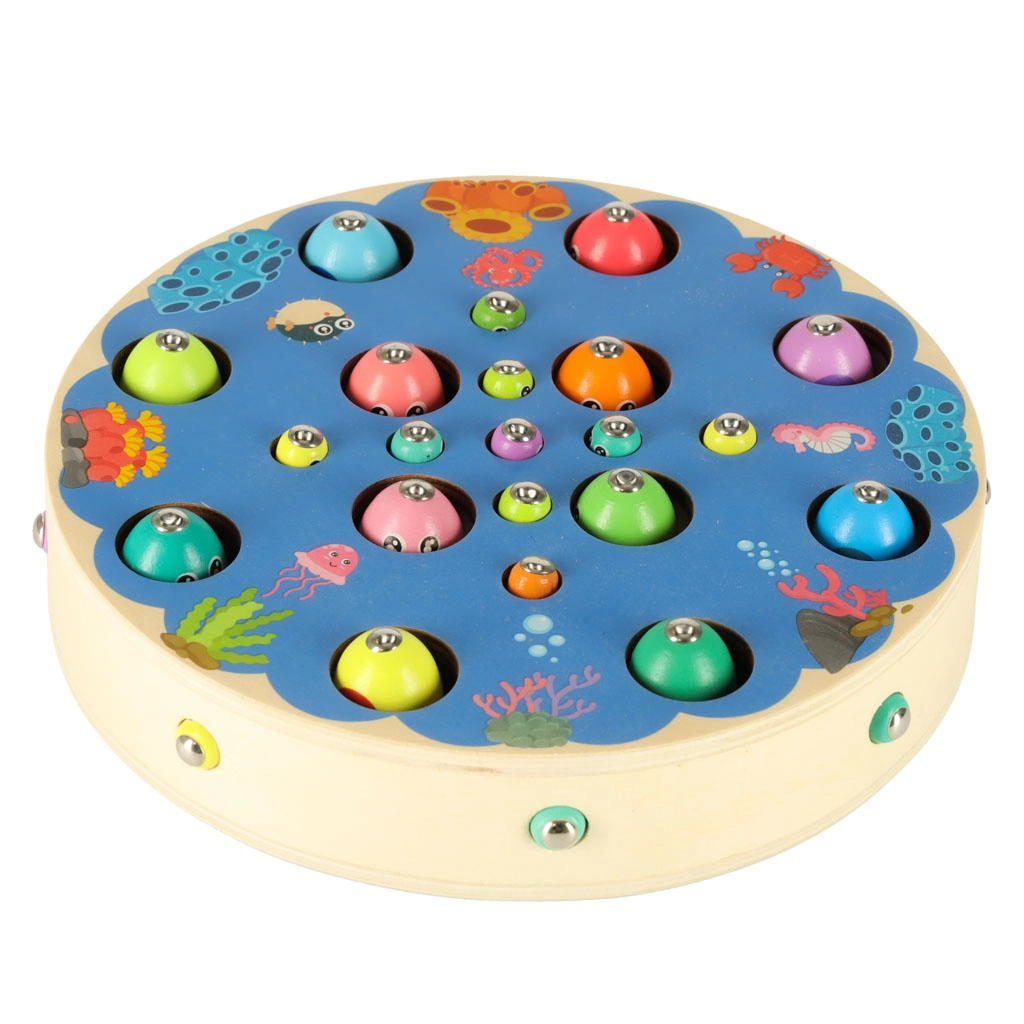Multifunkční montessori sada přináší dětem hodiny tvořivé zábavy i učení. Na kulaté dřevěné základně s oceánským motivem děti chytají magnetické rybky na pruty, vytahují housenky, přenášejí kuličky pomocí pinzety či hůlek a procvičují barvy, třídění a trpělivost. Díky bohatému příslušenství mohou hrát i ve více dětech.