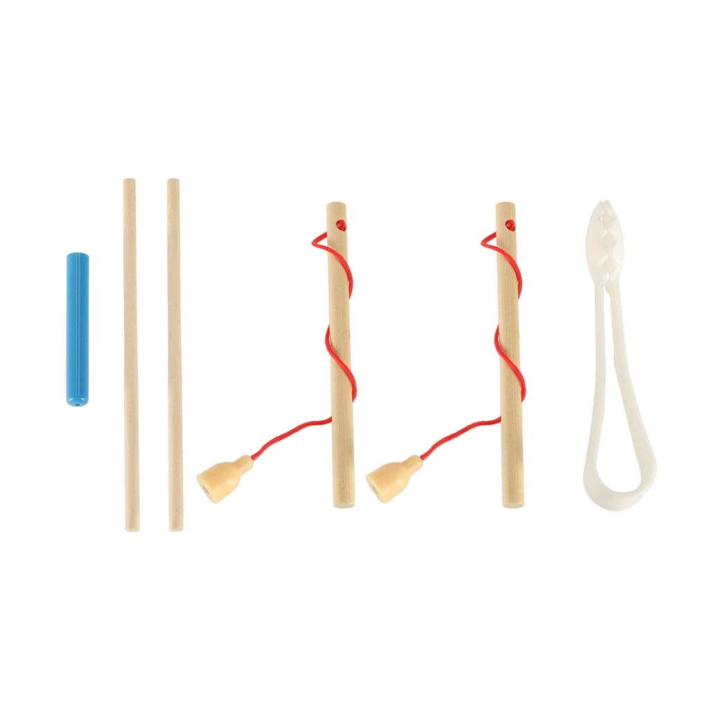 - 1× dřevěná základna, 2× prut, 2× hůlky, 1× pinzeta, 4× silikonová mistička, 10× dřevěná kulička, 12× rybka, 17× housenka, 16× pěšák ve 4 barvách, 1× kostka