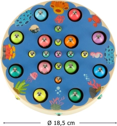 Díky velkému množství dílků je hra ideální i pro více dětí současně – jeden loví rybičky, druhý sbírá housenky a další třídí kuličky do silikonových misek. Bezpečné materiály a hladce broušené dřevo zajišťují pohodlné a bezstarostné hraní.