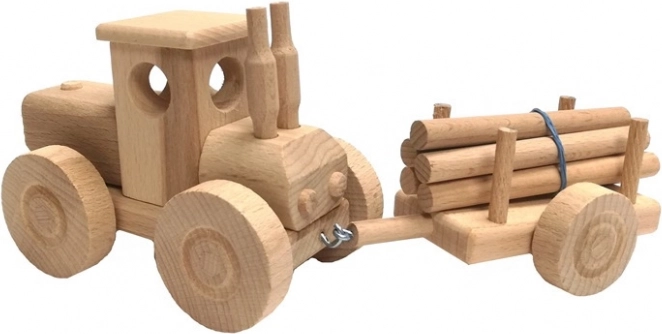 Díky zaobleným hranám a pečlivému leštění je hračka příjemná na dotek a bezpečná pro děti od 3 let. Rotující kolečka a funkční zapojení přívěsu podporují rozvoj jemné motoriky, fantazii i rolové hry na farmáře a lesní techniku.