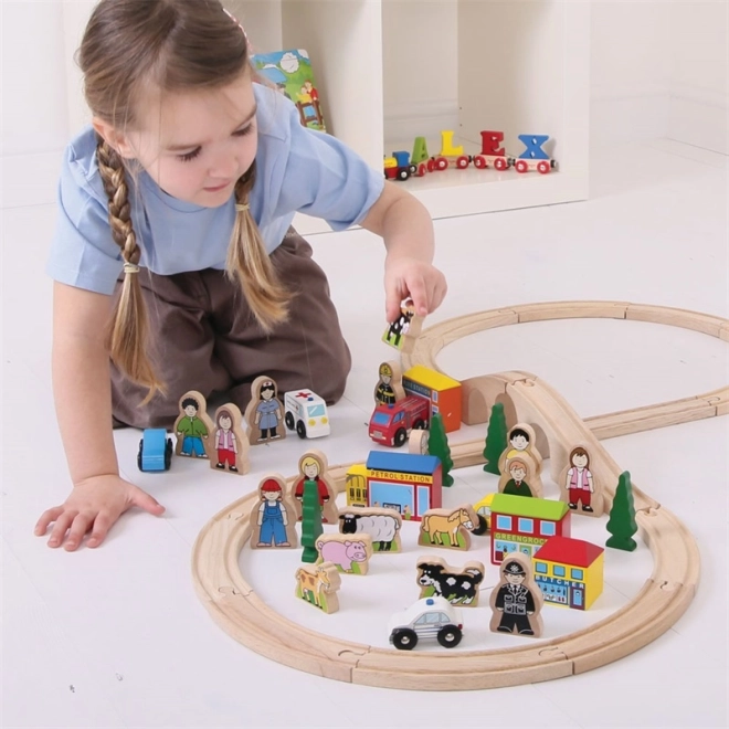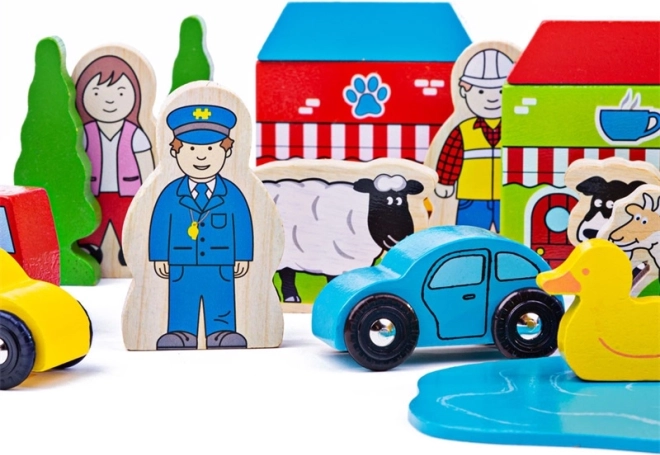 Tato bohatá sada přináší do každé dětské vláčkodráhy rušné městečko i venkov. Najdete v ní figurky jako policista a hasič, užitečná vozidla včetně auta a hasičského vozu, budovy, stromy i hospodářská zvířata – vše v odolném dřevěném provedení s příjemnými barvami. Děti si mohou vytvářet vlastní příběhy, zastavovat vlaky, řídit dopravu nebo pečovat o farmu.
