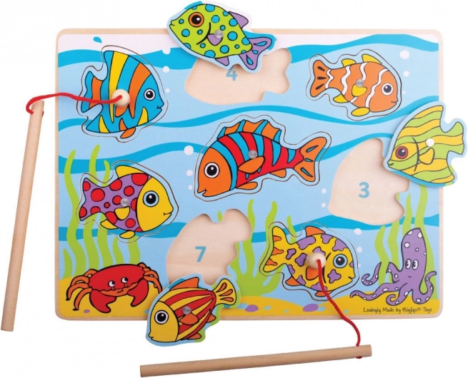 Zábavná dřevěná hra pro nejmenší, kde děti pomocí magnetické udice chytají pestrobarevné rybky a vracejí je do správných otvorů. Podporuje jemnou motoriku, koordinaci oko–ruka a soustředění. Vyrobeno z kvalitního dřeva ze zodpovědných zdrojů, splňuje evropské bezpečnostní normy. Balení obsahuje 10 dílů.