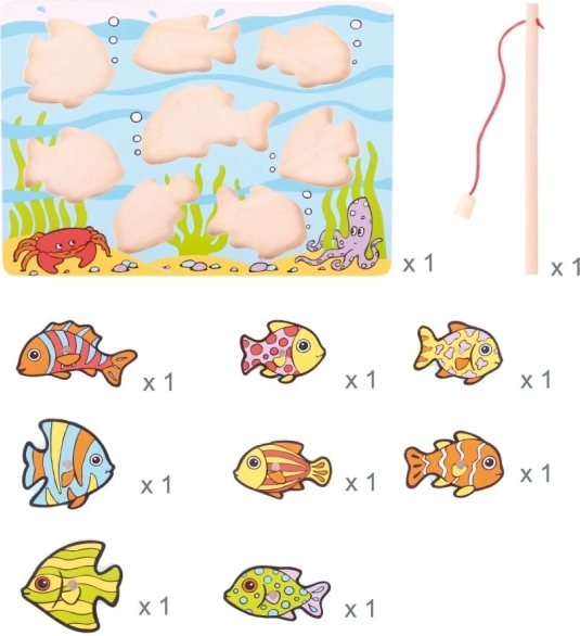 - Kompletní set: dřevěná deska, magnetická udice a rybky – celkem 10 dílů