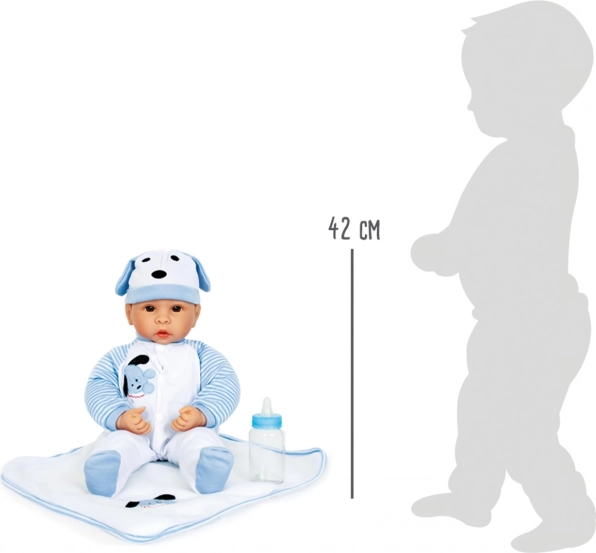 Panenka Beno je ideální společník pro všechny děti, které milují psy. Tato realistická panenka je oblečena v roztomilém modro-bílém oblečku se štěněcím motivem a je dodávána s kojeneckou lahvičkou a dudlíkem.