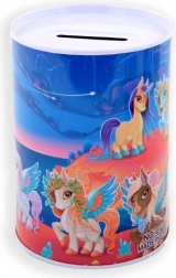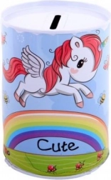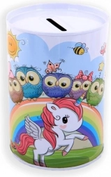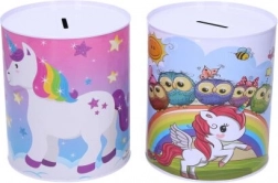 Pokladnička je zdobena veselými ilustracemi jednorožců, které přidají hravý dotek do každého dětského pokoje.