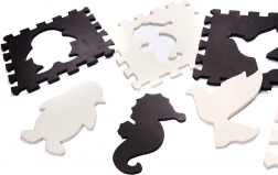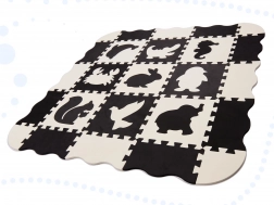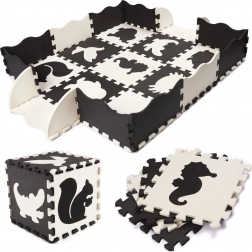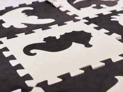 Velké pěnové puzzle v černé a bílé barvě s odnímatelnými prvky a zajímavými tvary zajistí skvělou zábavu pro dítě objevující svět. Díky puzzle lze vytvořit bezpečný prostor pro hraní dětí, kde měkká pěna tlumí všechny pády.