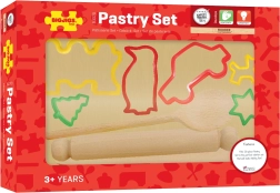 Dřevěný váleček, prkénko, vařečka a stěrka spolu s vykrajovátky motivují děti k objevování pečení, rozvíjejí jemnou motoriku a představivost.