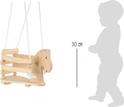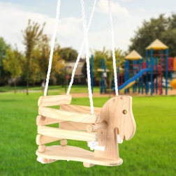 Hyjé, houpáním kupředu! Tato dětská houpačka ve tvaru koníka z masivního dřeva nabízí bezpečné a pohodlné sezení díky prostornému sedátku, opěrce a vyvýšenému hrazení. Postranní madla pro pevný úchop, odolná nylonová lana s kovovými kroužky a nosnost 30 kg zaručují stabilní a radostnou zábavu doma i na zahradě.