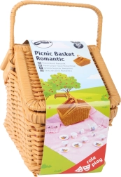 Romanticky laděný piknikový koš s vybavením pro čtyři „hosty“ přináší dětem realistický zážitek z venkovního stolování. V koši najdete talířky, šálky s podšálky, příbory i konvičku na kávu/čaj, cukřenku a konvičku na mléko. Díky pevnému provedení z umělého proutí a praktickému uspořádání je vše bezpečně uloženo a připraveno na cesty do parku i na zahradu.