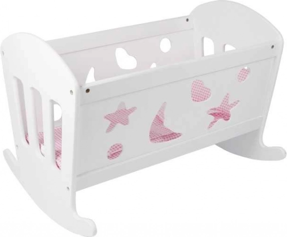 Stylová bílá kolébka pro panenky z kvalitního dřeva s vyřezávanými motivy měsíce a hvězd potěší každé malé pečovatelky. Součástí je matrace, polštářek a přikrývka pro pohodlné uspávání. Díky své stabilní konstrukci a kvalitnímu zpracování podporuje aktivní hru, rozvoj sociálních dovedností a skvěle se hodí i do školek.