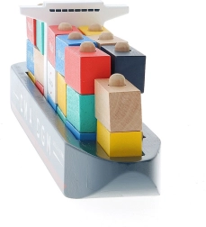 Tato stylová dřevěná kontejnerová loď přináší realistickou hru s kontejnery na kolících, které lze libovolně skládat, třídit a přemisťovat. Děti si procvičí koordinaci oko–ruka a naučí se základům logistiky a třídění barev a tvarů.