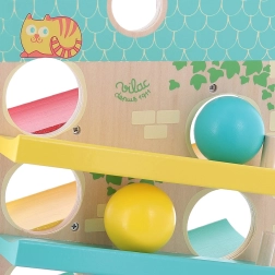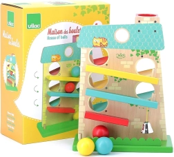Dřevěný kaskádový domeček VILAC nadchne malé děti svou zábavnou jízdou míčků a líbivým designem. Nabízí 3 rampy na obou stranách, po kterých se dřevěné míčky kutálejí shora dolů a při dojezdu do cíle zazvoní kovový zvoneček. Hračka v pastelových barvách rozvíjí zručnost i logické myšlení a poskytne hodiny radostné hry.