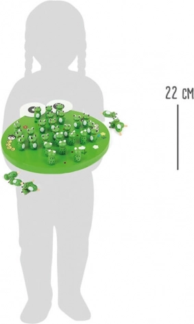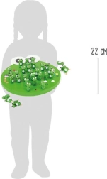 Barevná dřevěná deska ve tvaru žáby s květinami a broučky motivuje ke hře a podporuje představivost. Díky přehlednému rozložení otvorů se děti snadno zorientují.