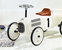 Stylové dětské odrážedlo ve vzhledu závodního vozu zaujme svým retro šarmem a kvalitním kovovým zpracováním. Nabízí tichou jízdu díky pogumovaným kolům, snadné řízení volantem a pevnou konstrukci s nosností 20 kg – ideální pro malé závodníky od 1,5 roku.
