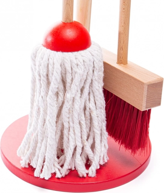 - Mop, smeták, lopatka, kartáč, dřevěný stojan