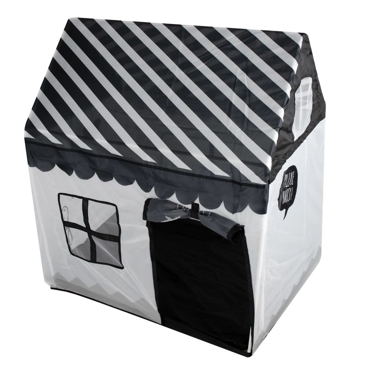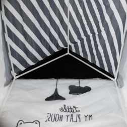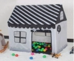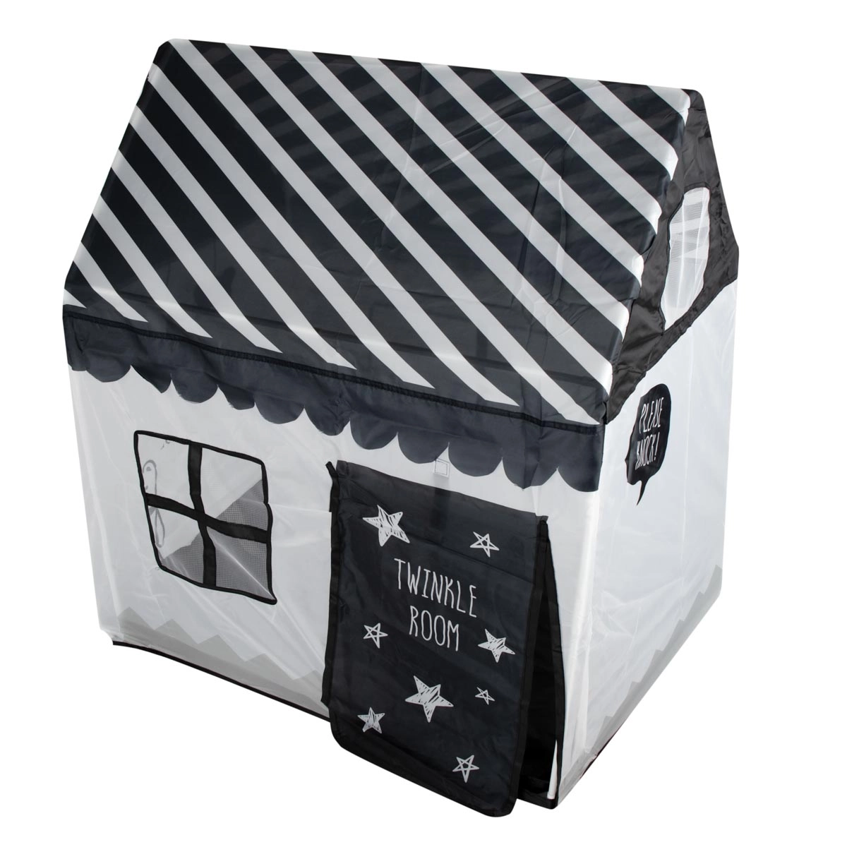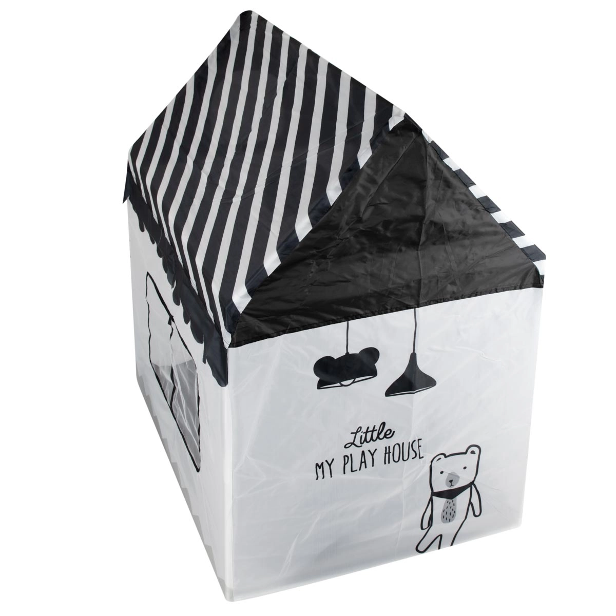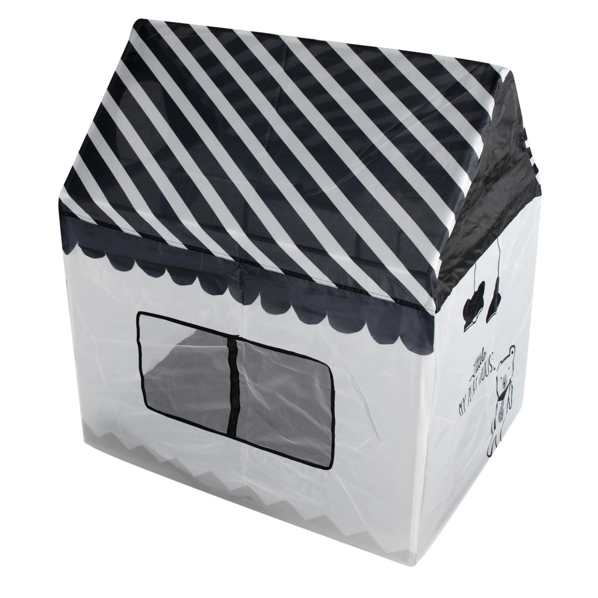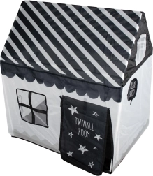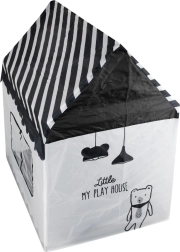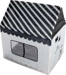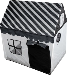 Krásný hrací domek zajistí vašemu dítěti spoustu zábavy i prostor pro odpočinek. Domek tvoří pevná dřevěná konstrukce s textilními stěnami a střechou, okna a dveře jsou vybavené záclonkami. Probouzí představivost a umožňuje Vám trávit čas spokojeně o samotě nebo ve větší skupině bez věkového omezení. Velikost domečku umožňuje pobývání více dětí současně nebo do něj umístit mnoho plyšáků, polštářů či jiných doplňků. Výrobek je ideální pro použití v interiéru i exteriéru, například na zahradě nebo v parku.