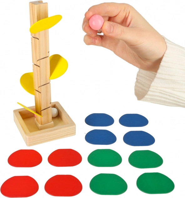 Děti spustí kuličku z vrcholku a ta se po jednotlivých barevných „listech“ roztočí a sklouzne až na podstavu. Každý dopad vytváří příjemný zvuk a motivuje k dalším pokusům. Hra přirozeně rozvíjí jemnou motoriku, koordinaci oko–ruka, trpělivost i vnímání barev a příčiny–následku.