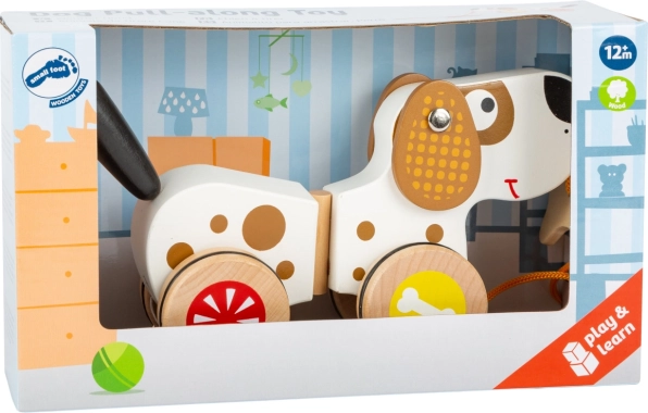 Pes má tichý chod díky gumovým kroužkům na kolech, což zajistí klidném pohybu po jakémkoli povrchu. S ocasem, který se vesele kýve při táhnutí, a kostí, jako odměnou pro pejska, nabízí nekonečné možnosti pro hru a zábavu.