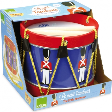 Rozvíjejte hudební cit a rytmus s tímto kvalitně zpracovaným dětským bubnem VILAC. Barevný design s motivem vojáčků, dvě dřevěné paličky a zlatý pletený popruh pro pohodlné nošení na krku potěší malé hudebníky. Dřevěná konstrukce, odolné zpracování a snadné hraní dělají z tohoto bubnu ideální volbu pro první muzikantské krůčky.