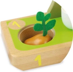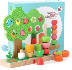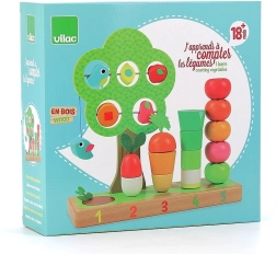 Tato kvalitní dřevěná hračka spojuje zábavu a učení v jednom. Děti skládají a navlékají mrkev, pórek, rajčátka a další tvary na očíslované kolíky 1–5, čímž si přirozeně osvojují počítání i třídění podle barev a velikostí. Součástí je i stromek s posuvnými prvky pro objevování a trénink koordinace oko–ruka.