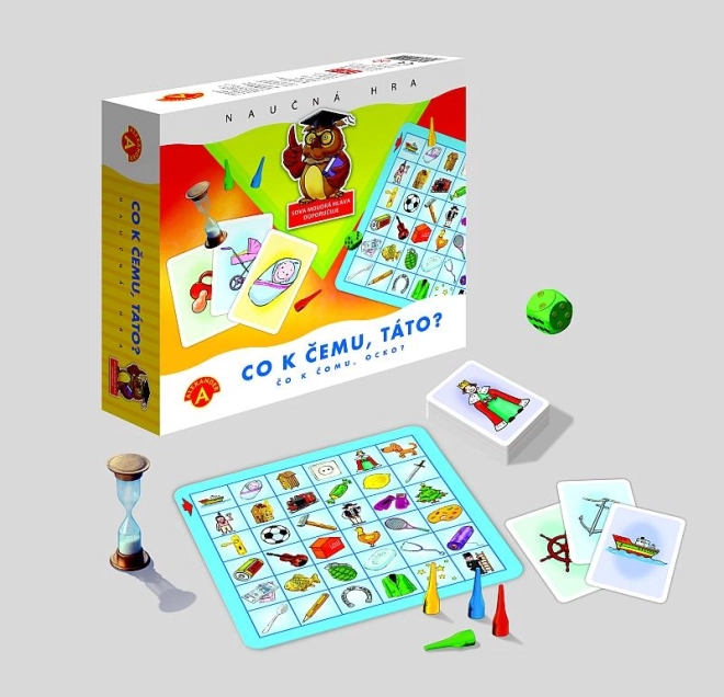 Hra 'K čemu, táto?' přináší tři úrovně obtížnosti, které se přizpůsobí věku a zkušenostem hráčů. Úkolem je nalézat souvislosti mezi obrázky na hrací desce a kartách, což posiluje dětské schopnosti v oblasti logiky a poznávání.