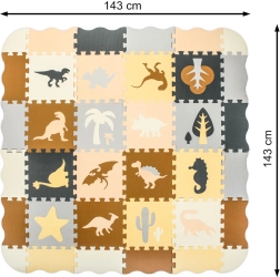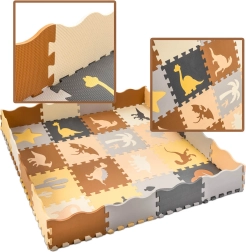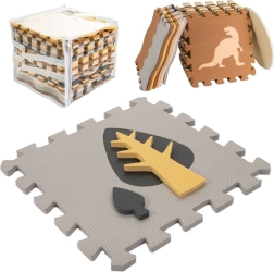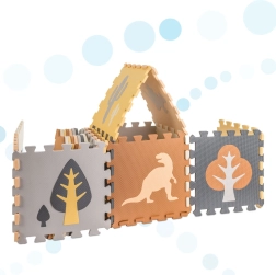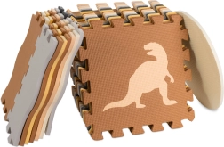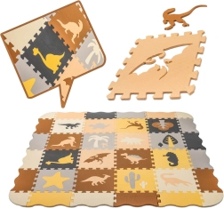 Tato pěnová podložka puzzle podporuje rozvoj dětské fantazie a motoriky. Vyjímatelné tvary dinosaurů slouží jako zábavný sorter – děti trénují rozpoznávání tvarů a koordinaci při vkládání motivů zpět na své místo. Kontrastní barvy a příjemná, strukturovaná povrchová úprava stimulují zrak i hmat.
