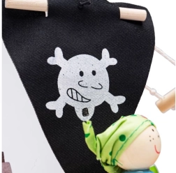 Tato dřevěná sada pirátské lodi obsahuje vše, co malí piráti potřebují ke svým dobrodružstvím. Balení zahrnuje kapitána, dva piráty, loď, kotvu, truhlu s pokladem a žraloka. Všechny hrací prvky lze prakticky umístit do lodi, takže je ideální pro cestování a snadné přenášení.