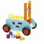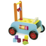Na bocích najdete průzory pro vkládání dřevěných tvarů, na levé straně otočné barevné válce a pod opěrátkem barevné otočné trojúhelníky. Sedací plocha je vybavena klaksonem se zvukovými efekty, který děti baví a motivuje k dalším objevům. Díky nízké výšce sedu je vozítko pohodlné i pro menší děti.