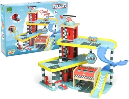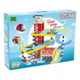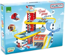 Objevte zábavu s dřevěnou garáží VILAC Vilacity! Tato velká patrová garáž nabízí funkční výtah, zatahovací dveře, parkovací závoru, čerpací stojan i mycí kartáče. Součástí jsou 2 autíčka a helikoptéra, plná kompatibilita s kolekcí VILACITY a ekologická výroba.
