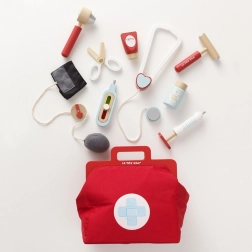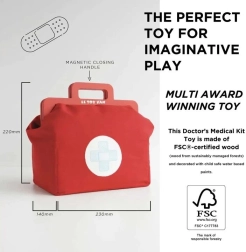 Stylová doktorská sada pro malé lékaře a lékařky v textilní brašně s dřevěnými uchy přináší vše potřebné pro hru na ordinaci. Obsahuje celkem 10 dílů včetně stetoskopu, teploměru a injekční stříkačky. Hračka je genderově neutrální, podporuje jemnou motoriku, představivost a kognitivní dovednosti. Vyrobeno z udržitelného dřeva s certifikací FSC a ručně domalováno netoxickými barvami na vodní bázi.