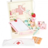 Díky realistickým doplňkům jako je stetoskop, teploměr, injekční stříkačka, masti a léky, si děti procvičí sociální dovednosti, empatii a komunikaci. Odolné materiály (dřevo, textilie a papír) zajišťují bezpečnou a dlouhotrvající zábavu.