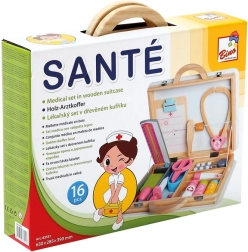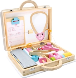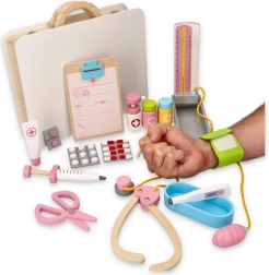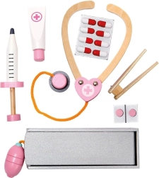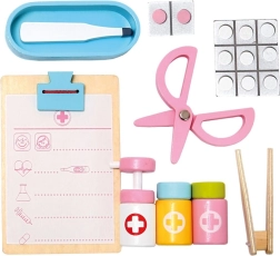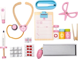 Součástí setu jsou dřevěné nástroje jako stetoskop, injekční stříkačka a další pomůcky, které podporují realistickou hru.