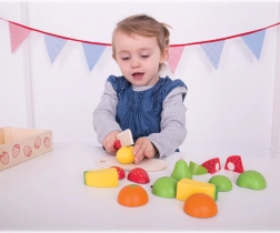 Realistické prkénko a dřevěný nůž podporují hru na kuchaře bez rizika. Dílky ovoce drží pohromadě a při krájení se snadno oddělí.