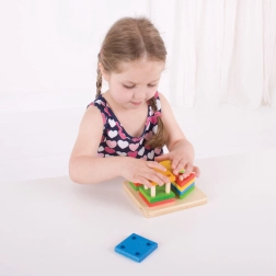 Pestrobarevné kruhy, čtverce, trojúhelníky a obdélníky podporují rozlišování barev a tvarů. Kolíky a dílky pomáhají s raným počítáním.
