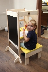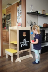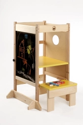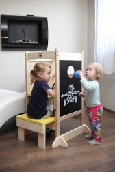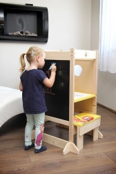 Díky promyšlenému designu věž snadno přeměníte na stoleček se židličkou a také na kreslicí tabuli na křídy. Dvě výškové polohy stojací plochy se přizpůsobí růstu dítěte a poskytnou pohodlné a bezpečné používání.