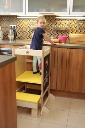 Stabilní dřevěná konstrukce a ohrádka kolem plošiny umožní dětem bezpečně dosáhnout na pracovní desku a zapojit se do každodenních činností.