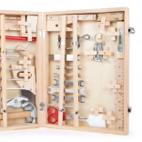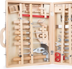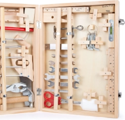V kufříku najdete vše, co je potřeba pro drobné domácí projekty a hry na řemeslníky: klíče, šroubováky, pilu, nůžky, dláto, tesařskou tužku, šestihranný klíč, kladivo a další doplňky. 48dílná sada podporuje jemnou motoriku, soustředění i kreativitu.