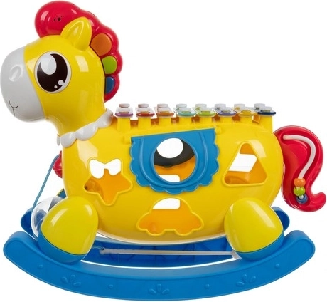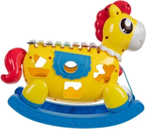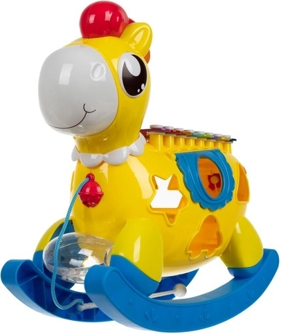 Tělíčko koníka poslouží jako třídička. Balení obsahuje barevné kostky v 7 tvarech. Aby kostky přistály v bříšku zvířete, musí batole přiřadit odpovídající kostku k otvoru. Při hře s tímto jedinečným koněm budou dítě provázet podnětná, barevná světýlka a příjemné melodie, které zábavu rozhodně zpříjemní.
