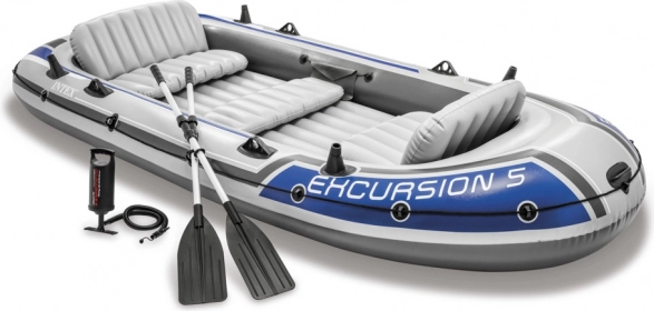 Robustní nafukovací člun Intex Excursion 5 pro až 5 dospělých nabízí nosnost 455 kg, 3 vzduchové komory pro bezpečí a pohodlné nafukovací sedačky s opěrkou. Součástí jsou hliníková vesla, výkonná ruční pumpa a držáky na rybářské pruty. Ideální pro rekreační plavby, rybaření i výlety po jezerech a klidných řekách.