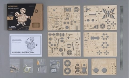 Sada obsahuje vše potřebné: předřezané dílky z překližky, ocelové hřídele, diodu, filmový pás i ilustrovaný návod s QR kódem na montážní video. Model je skvělým dárkem a zároveň designovou dekorací do pracovny či obývacího pokoje.