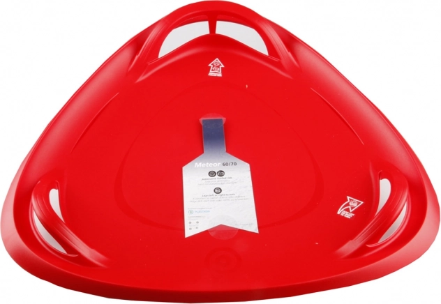 Sáňkovací talíř METEOR v červené barvě přináší skvělou kombinaci jednoduchosti a rychlosti. Nový trojúhelníkový tvar zlepšuje stabilitu a umožňuje pohodlné sezení i dospělým jezdcům. Díky kompaktním rozměrům se snadno přenáší a je připraven kdykoli vyrazit na kopec.