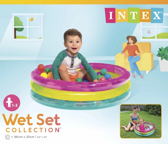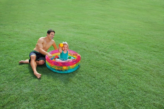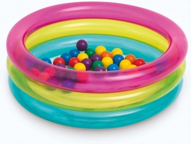Veselý nafukovací bazének s míčky od INTEX promění každý dětský pokoj i zahradu v bezpečné hřiště. Transparentní stěny s růžovým, žlutým a modrým pruhem. Odolné PVC zajišťuje snadnou údržbu a dlouhou životnost, ideální pro děti 1–3 roky.