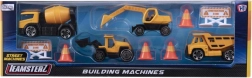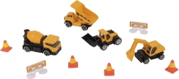 Kombinace žlutých a černých plastových stavebních vozidel, jako je sklápěč, míchačka, bagr a nakladač, dodává dětem možnost simulovat skutečné stavební prostředí.