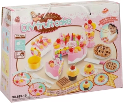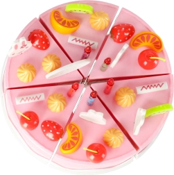 Veselá růžová sada s dortem na krájení potěší malé cukráře od 3 let. Dort z 6 dílků se spojuje pomocí suchých zipů a lze ho krájet plastovým nožem. Bohatá výbava ovoce, ozdob a náčiní podporuje fantazii, rolové hry a jemnou motoriku.