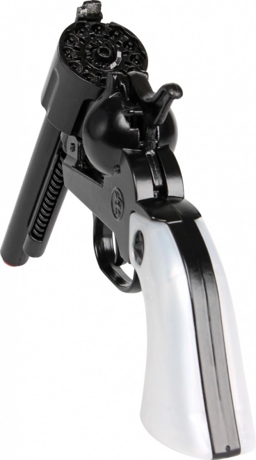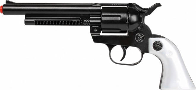 Tento kovbojský revolver na kapslíky přináší realistický vzhled a odolné zpracování. Díky kombinaci kovu a plastu je lehký do ruky, přitom dostatečně bytelný pro časté hraní. Dlouhá hlaveň a bílá střenka podtrhují klasický vzhled historického revolveru.