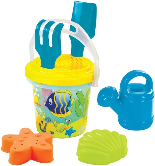 Veselá transparentní písková sada pro děti ve třech motivech – víly, dinosauři a rybičky – přináší spoustu zábavy na pískoviště i pláž. Obsahuje kyblík 1,3 l, hrabičky, lopatku, sítko, konvičku a dvě bábovky. Vyrobeno v EU z kvalitního plastu.