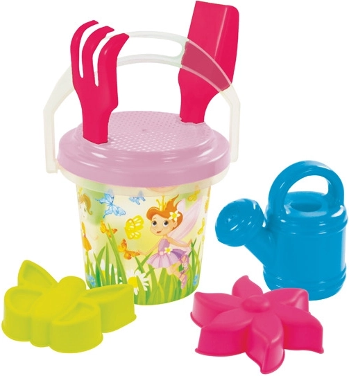 - Kompletní výbava: kyblík 1,3 l, hrabičky, lopatka, sítko, konvička a 2 tematické bábovky