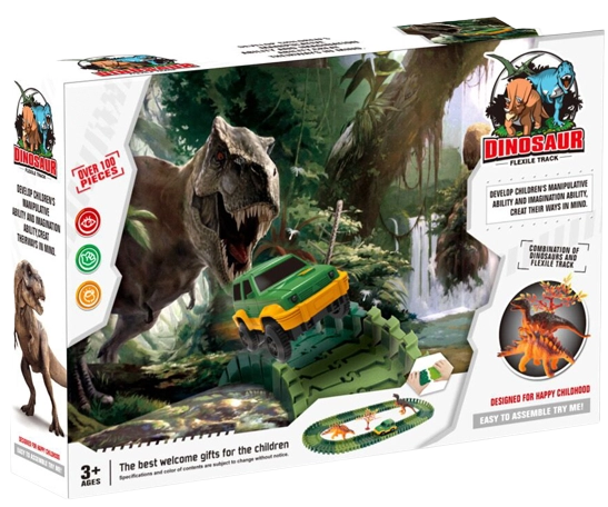 - Variabilně sestavitelná dráha, 3 pravěká zvířata, strom, svítící autíčko