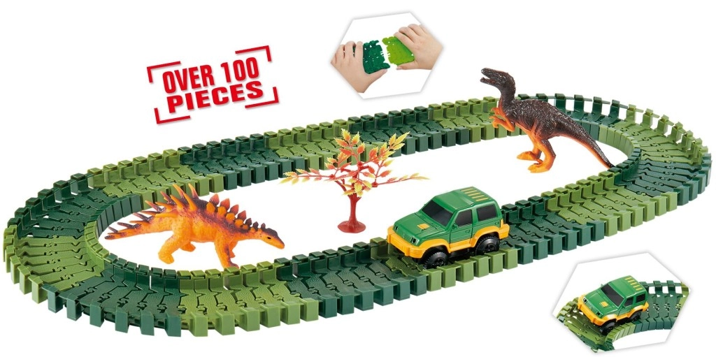 Tato variabilní dráha s dinosaury nabízí až 100 dílů pro nekonečné kombinace a stavění. Děti si snadno poskládají vlastní trasu a vyrazí na dobrodružství se svítícím autíčkem, které díky kompaktní velikosti 9,5 × 5,5 cm hladce projíždí oblouky i mostky. Tematické doplňky v podobě tří pravěkých zvířat a stromu podpoří fantazii a vtáhnou malé objevitele do světa dinosaurů.